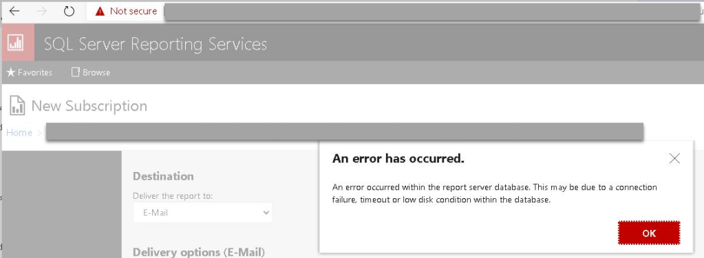 With both SSRS databases on AG, most of the functionality is available, so SSRS Report Portal will serve reports (records from the datasource, datasets, and catalog tables) and obey the security mechanism (users, policies, role tables), but SSRS subscription will suddenly stop working (despite the subscription table being in-sync). Any existing SSRS subscriptions will stop working regardless if SSRS GUID job (unfortunately, Microsoft never got to make SSRS jobs user-friendly) is enabled or not. Trying to create a new SSRS subscription will be greeted with a very cryptic error message (Fig #1).