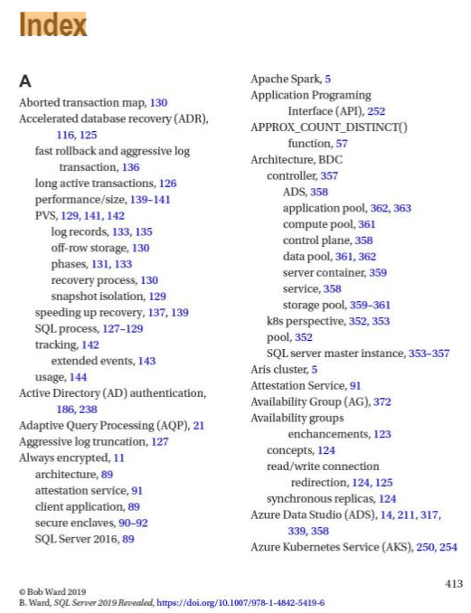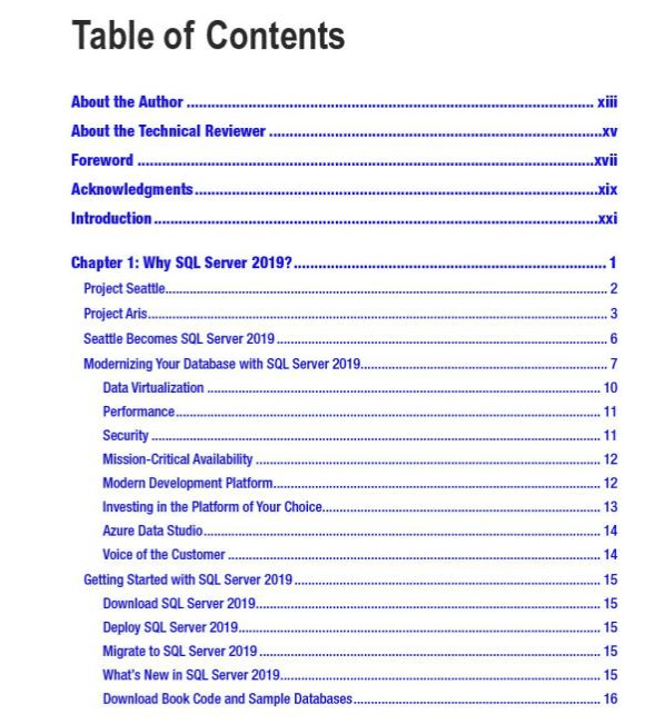 Virtually all books have a table of content (a.k.a. TOC) at the beginning of the book (see Fig #1) and index at the end of the book (see Fig #2) to make searching for content as quick and efficient as possible. Additionally, book TOC and index are also allowing the book author to better organize his/her thoughts when writing a book which is very similar to making SQL Server storage engine more efficient.