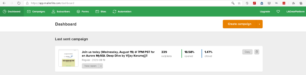 https://www.mailerlite.com (freemium) – maintains list of members, sends and schedules newsletters, engages the audience (see Fig #4)