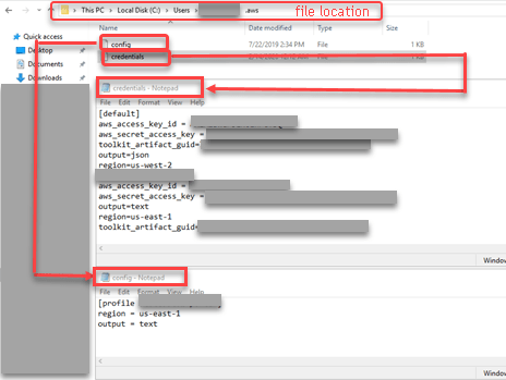 - Add both config and credentials files to an .aws folder that is under the user folder (see Fig #3). While Config file contains just pieces of the profile data, Credentials file contains all the keys to the “S3 kingdom”