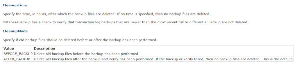 Ola’s maintenance script handles DatabaseBackup procedure handles both database backups and retention in the same run. It could run Full, Diff, and Log database backups while also applying database backup file retention (via CleanupTime and CleanupMode). The first defines what to delete, while the latter defines when to delete it.