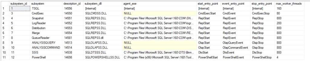 In SQL Server Agent Execution of each supported job step is handled by a subsystem. Except for TSQL steps, each subsystem is handled by an external .dll file that is loaded into SQL Agent’s process at startup. Each subsystem takes information about the job step to execute and interprets it according to its own definition.