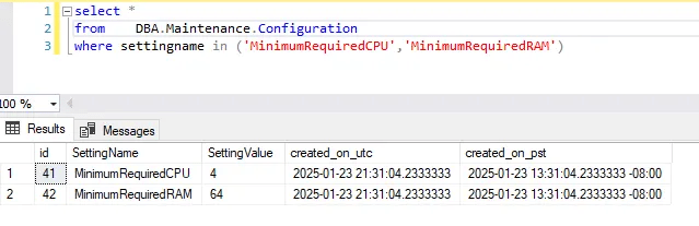 Check for required VM resources based on CPU and RAM values in DBA.Maintenance.Configuration table